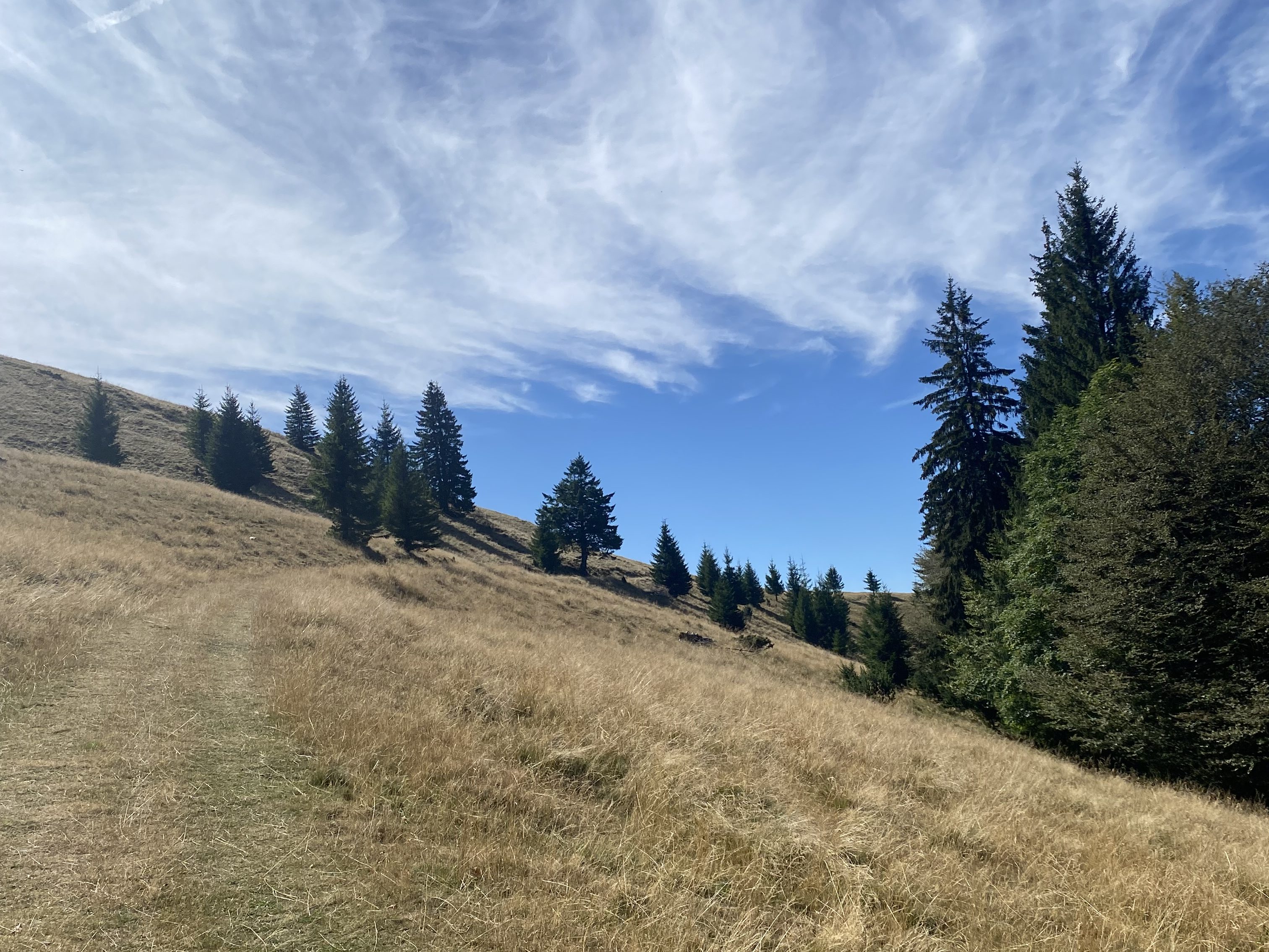 Once in Azuga, I turned right out of the train station and walked along the main road for about five minutes. That’s when the trail begins, marked with a blue triangle. The climb starts right away and stays steady for about an hour to an hour and a half. The path is wide and clear the entire way. There are no tricky or technical sections — just a steady uphill on open ground and forest track. The higher you go, the better the views get. Eventually, the forest thins out and you can see the Bucegi Mountains across the valley.