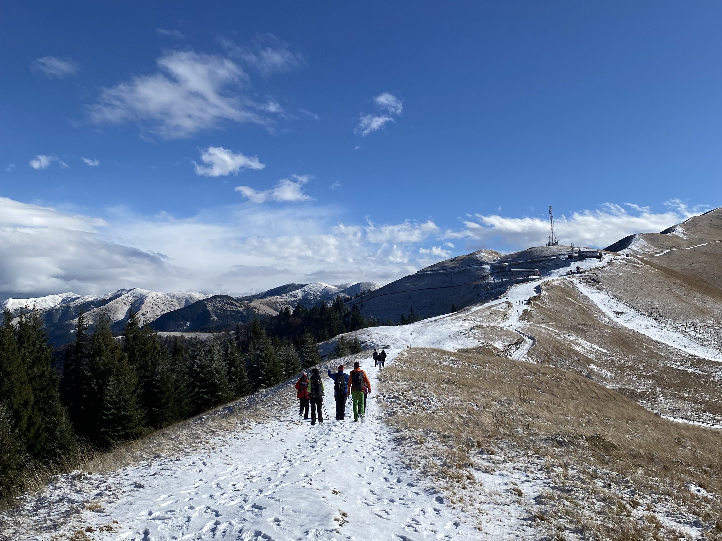 When the climb evens out, the views open up completely. Ahead of you are rolling ridges, and behind you, the sharp peaks of Bucegi. After a short walk on the flat, you’ll reach the top of the Azuga cable car. There’s a small shop here that sells drinks — a perfect excuse to stop, rest, and take it all in.